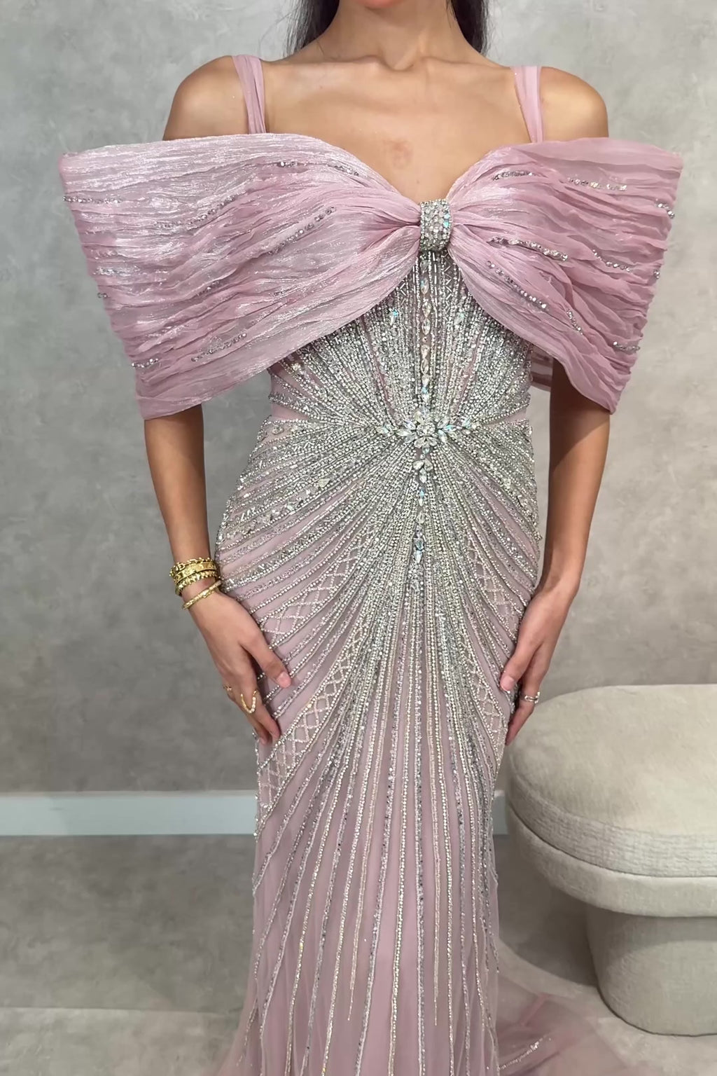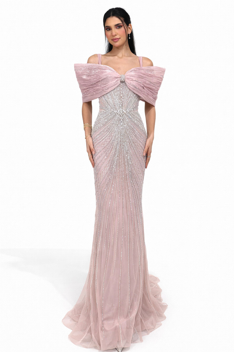 This elegant dusty pink gown features a fitted silhouette adorned with intricate shimmering beadwork that creates a beautiful radiating pattern throughout the dress. The design is complemented by a soft off-shoulder draped detail across the bodice, adding a touch of modern sophistication and graceful structure.