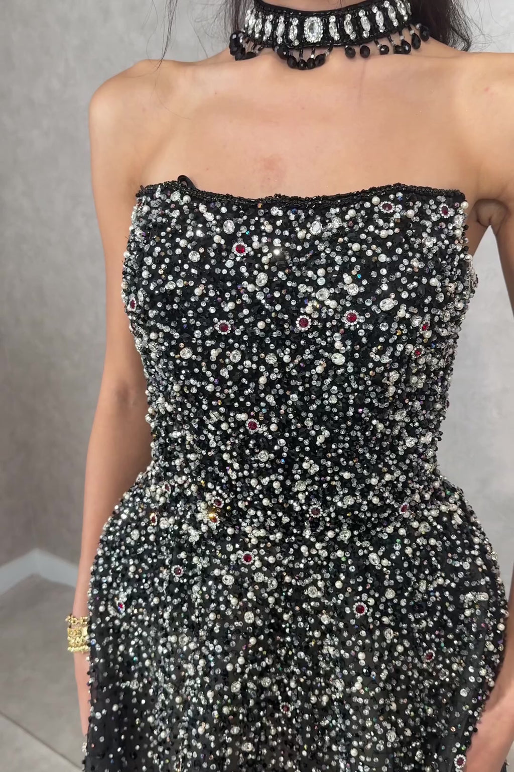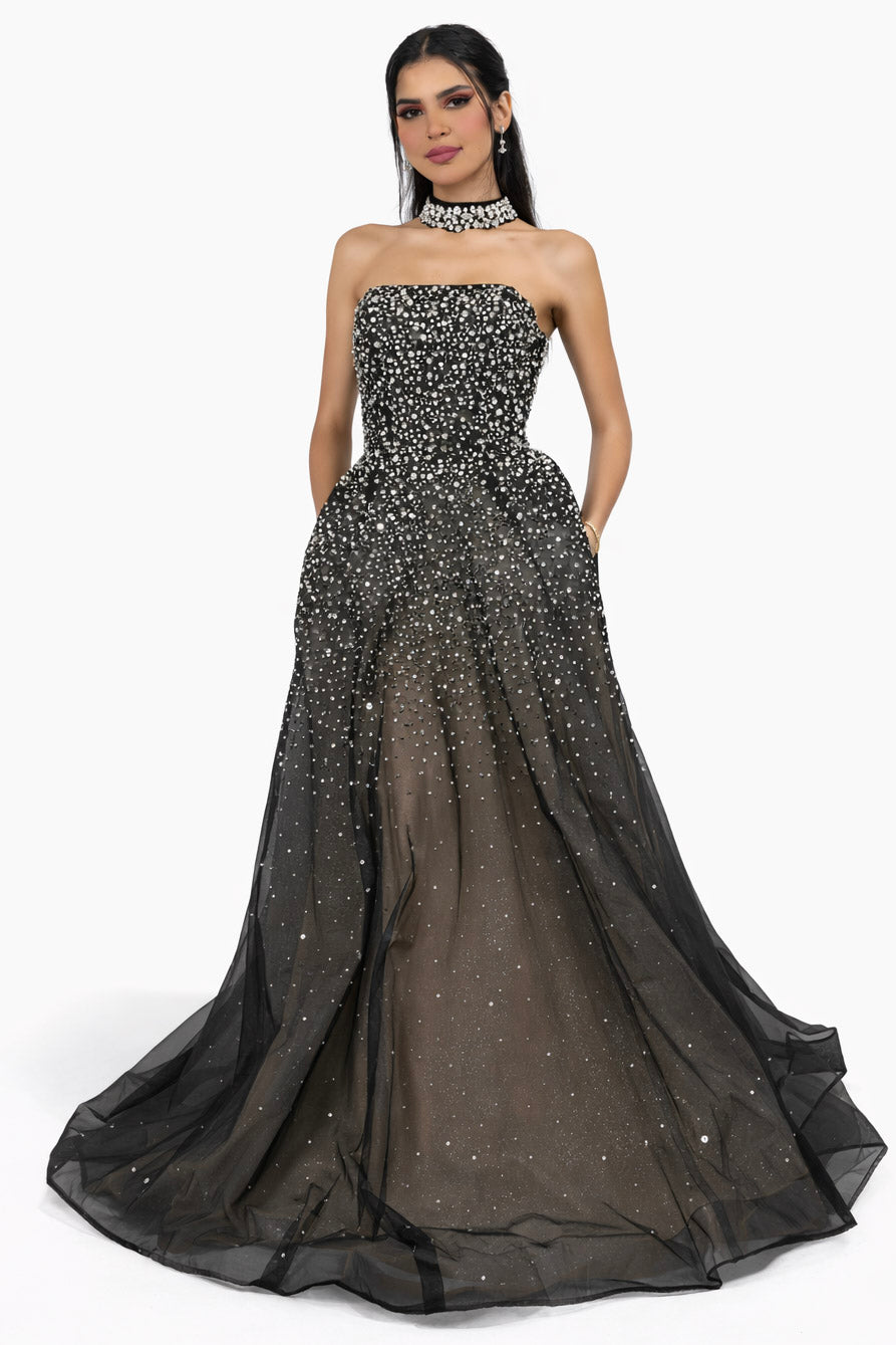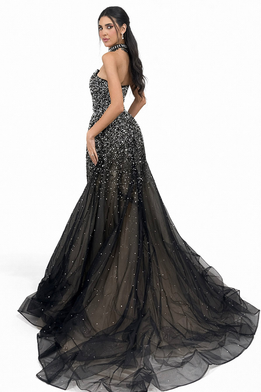 This breathtaking black with nude-underline ball gown features a strapless, structured bodice adorned with delicate, fine hand-applied beadwork that shimmers beautifully with every movement. The intricate smaller bead detailing gradually flows into a soft, voluminous tulle skirt, creating an elegant and ethereal silhouette. The stone-choker piece adds on extra glamour and personality to this piece.