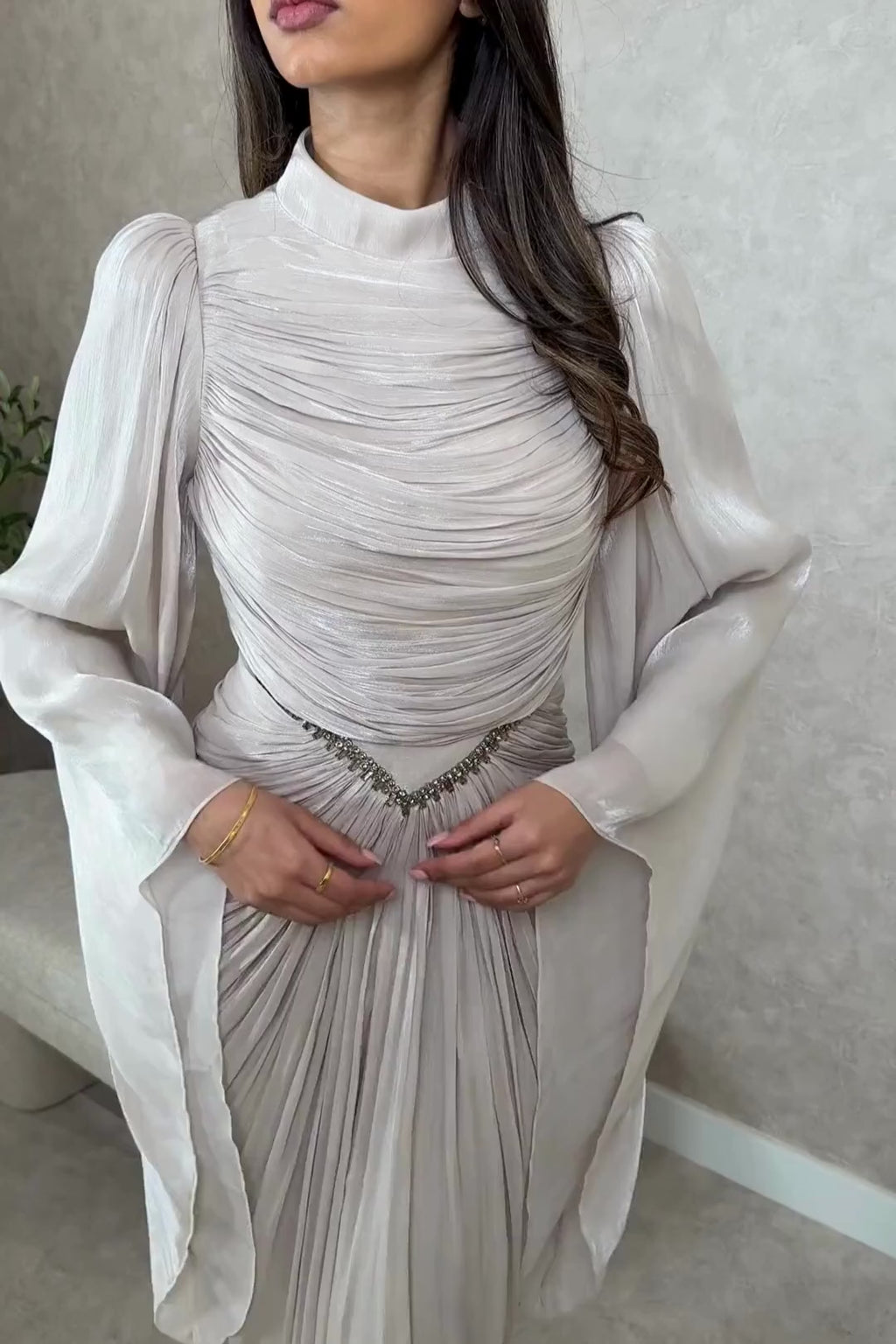 This elegant beige gown features a beautifully draped bodice that creates a flattering, sculpted silhouette. Designed with flowing chiffon cape sleeves and soft pleating through the skirt, the gown moves gracefully while maintaining a refined look. A delicate crystal-embellished waist detail adds a subtle touch of sparkle, making it a sophisticated choice for formal events and evening occasions