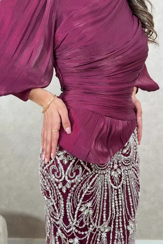 This striking burgundy gown combines elegance with intricate detail. The softly draped bodice features a flattering wrap design and voluminous long sleeves, while the skirt is adorned with shimmering beadwork in an ornate pattern that catches the light beautifully. A refined choice for formal occasions, evening events, and special celebrations.