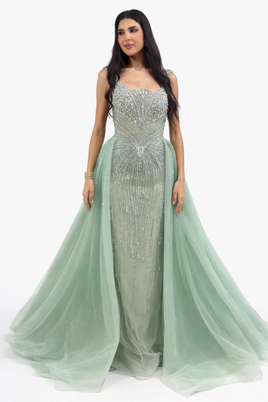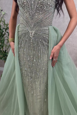 This enchanting mint green gown features a sculpted fitted silhouette with a romantic sweetheart neckline and a soft flowing overskirt that adds graceful volume and movement. The gown is intricately adorned with fine beadwork and crystal stones throughout, creating a radiant, cascading pattern across the bodice and skirt. Delicate dangling water-drop shaped glass beads add beautiful movement and sparkle with every step.