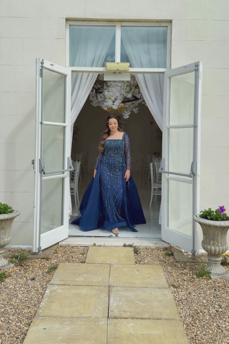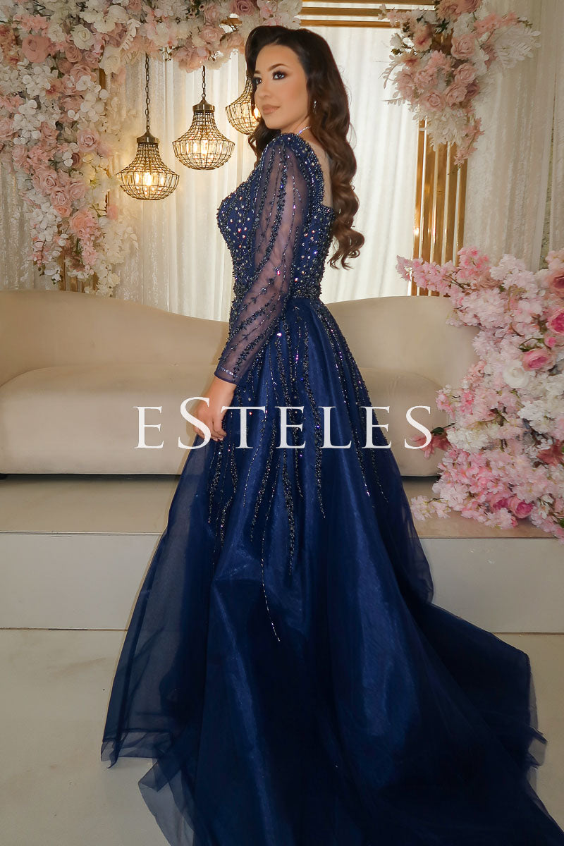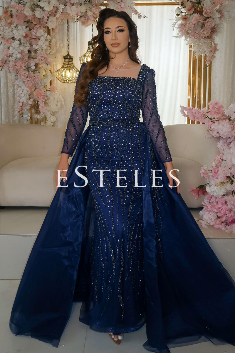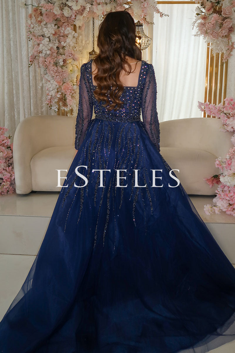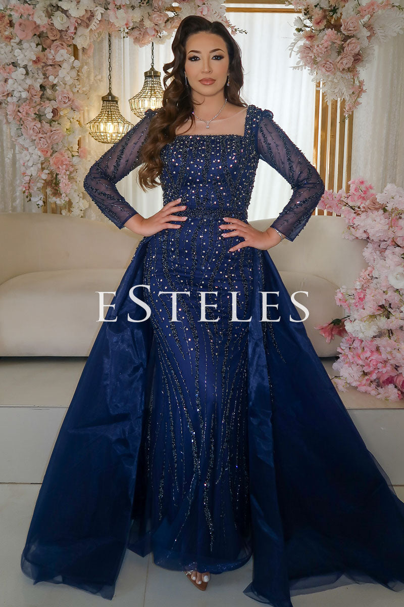 Step into elegance with the Alexadndra, a deep navy creation adorned with glistening beadwork and a structured square neckline. Sheer embellished sleeves and a detachable overskirt bring classic glamour to this regal silhouette